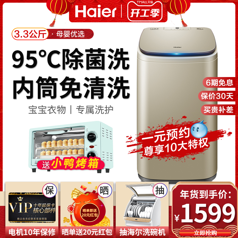 天猫券~海尔洗衣机迷你免清洗3.3kg婴儿童高温除菌全自动小型MBM33-R178~满减日更