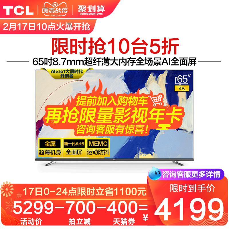 大家电:TCL 65Q6 65英寸4K高清智能全面屏网络平板液晶电视机官方优惠前价格:¥5299.00元(人民币)月销售:37件我是土豪,不需要优惠券…… 直接去下单!别拦我!!要不找卖家 ~ 天猫店 @TCL电视官方旗舰店 聊聊先吧?再多聊会儿就被抢光啦… 赶紧抢吧!~ ~ ~ ~ ~ ~ ~ ~ ~ ~ ~ ~ ~ ~ ~ ~ ~