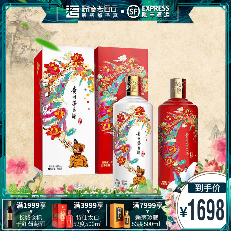 天猫券~歌德老酒 43度贵州茅台喜宴优雅白+中国红500ml百年好合白酒2瓶~满减日更