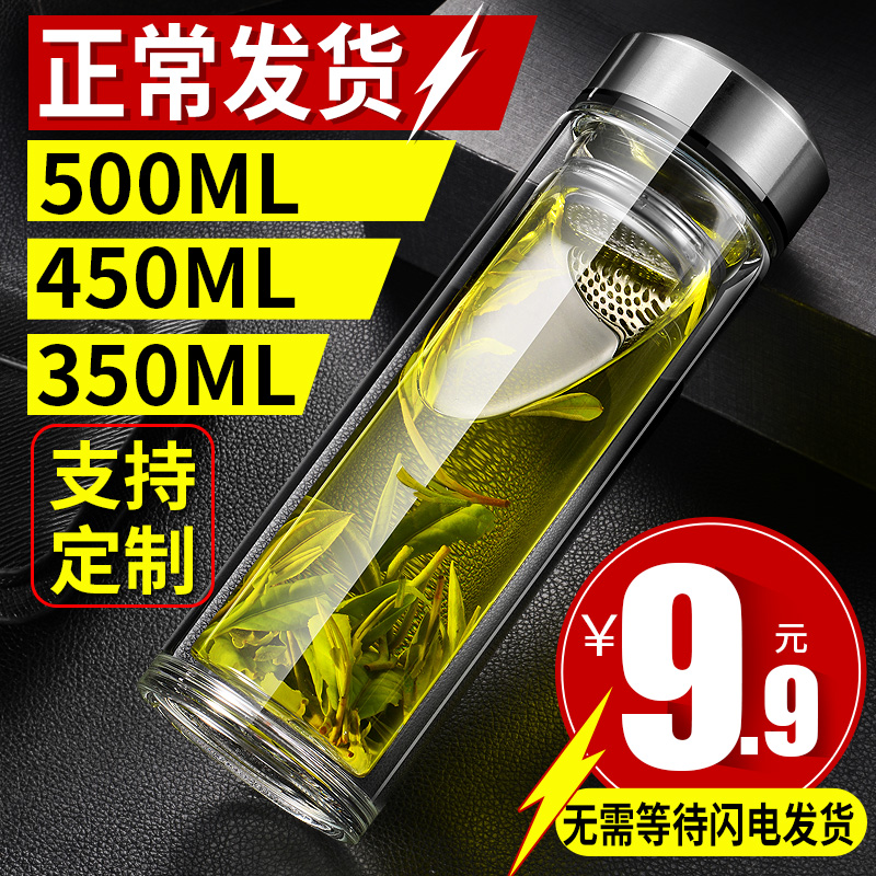 天猫券~双层透明玻璃杯男女便携学生家用隔热水杯子带盖过滤网泡茶杯定制~满减日更