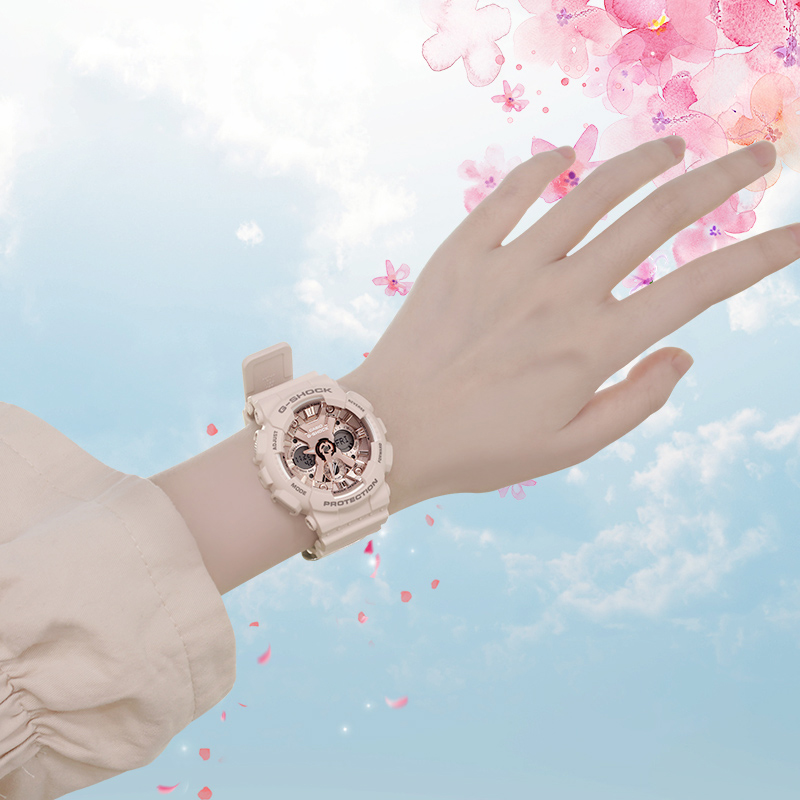 天猫券~卡西欧手表官方女限量独白虎官网运动樱花粉GMA-S120旗舰店石英表~满减日更