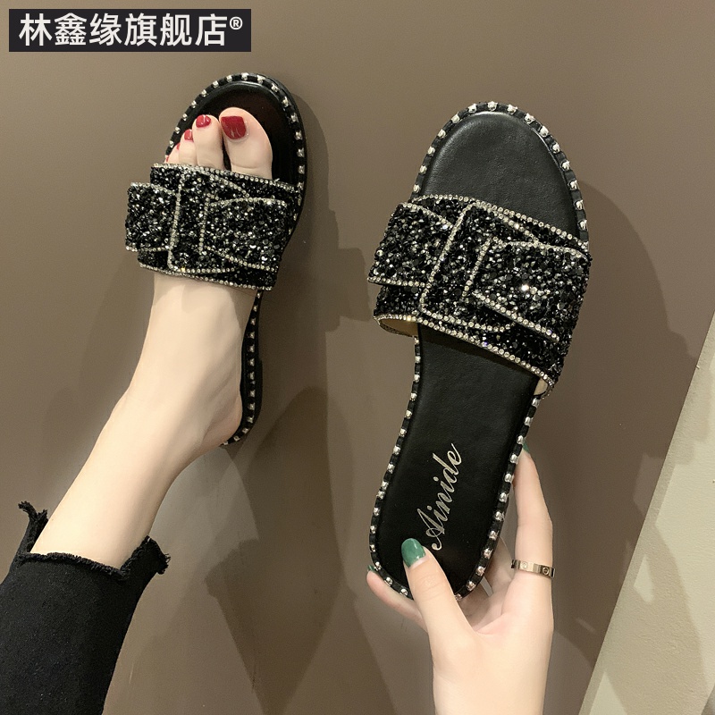 天猫券~水钻凉拖鞋女夏外穿2019新款韩版室外平底网红一字拖百搭半拖鞋潮~满减日更