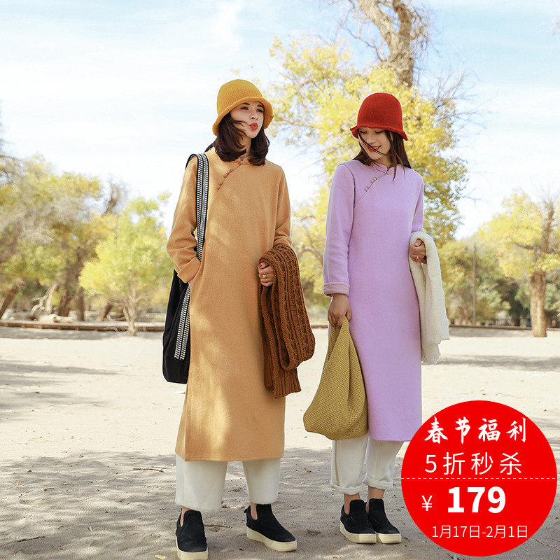淘宝券~麻霖文艺原创棉麻女装2019秋冬新款中式立领盘扣毛呢连衣裙袍子~满减日更