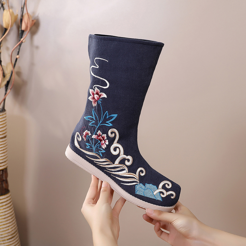 淘宝券~古风皂靴春季新款古装绣花女鞋汉服鞋中筒靴子平底防滑翘头履弓鞋~满减日更