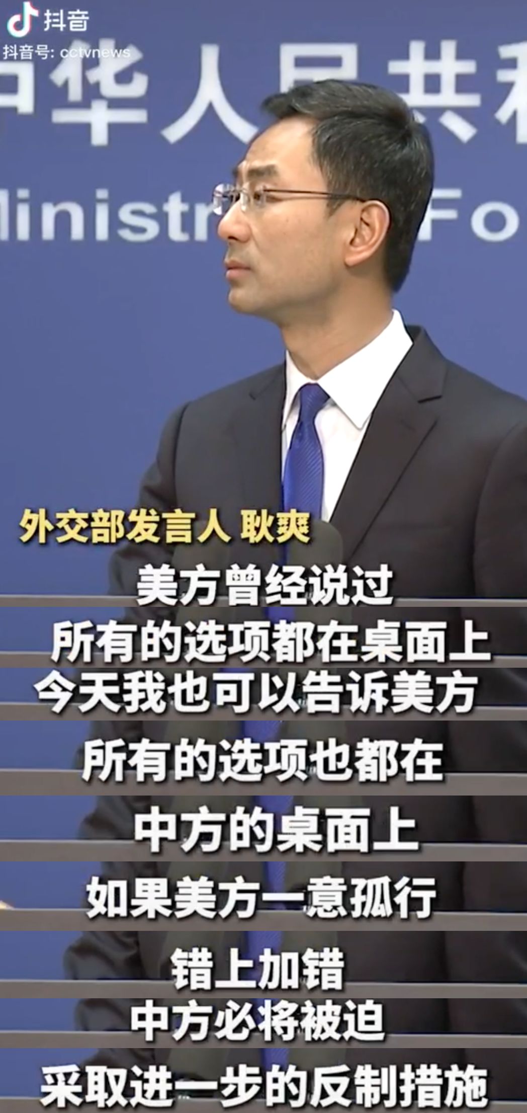 而耿爽将这句话送给了美方:美方曾经说过,所有的选项都在桌面上,今天我也可以告诉美方,所有的选项都在中方桌面上。