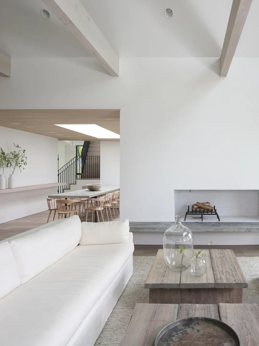在室内,宽敞的玻璃窗提供了充足的自然光线,柔和地照射在哑光石膏墙壁上,它的独特瑕疵在光线下显而非常不一样的感觉。通过使用再生材料和尊重的色调,Bruns Architecture和Lindsay Pauly巧妙地设计了一个功能性的家庭度假村,庆祝其风景如画的环境。