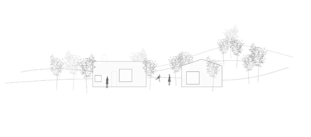 设计目标是最大限度地连接到户外,独特的住宅有两个由单层结构组成的山墙建筑,将娱乐空间与私人卧室分隔开来。这栋房屋的外立面完全覆盖着用橡胶轮胎回收的黑色瓷砖,并与一个巨大的白色抹灰烟囱并列,反映出客户对单色内饰的喜爱。