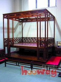 在古代,这样的睡床是一般绅士人家经常可见的摆设,根据居家的房门形式设计,现代睡床则是将床脚部分向上延伸成四根床柱,上方再加上床顶设计,就好像将床铺整个包围起来。