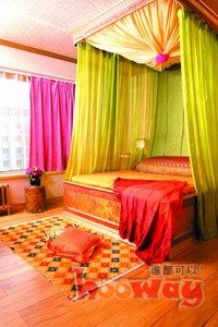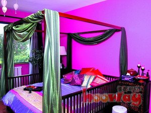 泰国风情总是散发着蛊惑人心的欲望气息,泰式的香艳也让人想入非非。用黑橡木、以线条构造而成,三面围合的泰式床也具有自我阵地的隐喻,但是,相对于欧陆风的奢靡、中式的平和,泰式在用色、情趣方面的营造更高一筹,加之泰丝在全世界的闻名,床幔的做法一般透明而性感,若隐若现的情趣更为刺激。